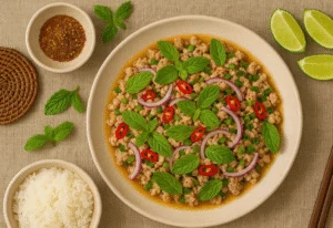 Dieser Salat ist eine Geschmacksexplosion! Yam Mamuang spielt mit dem Kontrast aus extrem saurer grüner Mango, süßem Palmzucker, salziger Fischsauce und feurigem Chili. Anders als der bekannte Som Tum (Papayasalat), der im Mörser gestoßen wird, ist dieser Salat ein „Yam“ – also ein gemischter Salat. Das macht ihn noch einfacher und schneller in der Zubereitung. Er ist knackig, frisch und die perfekte Beilage zu gegrilltem Fisch oder einfach als leichter Snack.